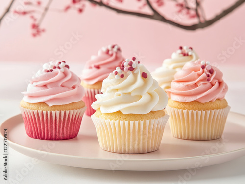 cupcake, frosting, pink, white, sprinkle, dessert, cherry, blossom, celebration, sweet, bakery, pastel, floral, party, treat, epicure, delicious, sugar, cream, decoration, festive, indulgence, food, table, vanilla, colourful, whipped, soft, round, plate, arrangement, spring, seasonal, display, charming, summer, background