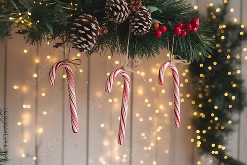 Delightful Festive Candy Cane Ornaments Hanging Amongst Christmas Garland and Twinkling Fairy Lights for a Charming Holiday Display.