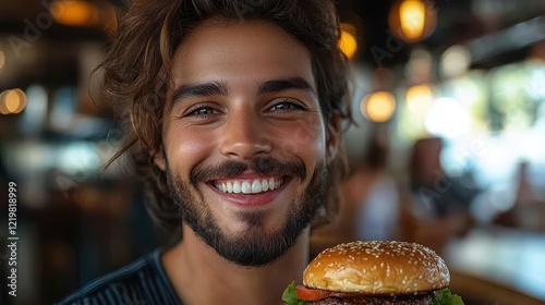 Delightful young woman savoring a hamburger in a lively pub atmosphere