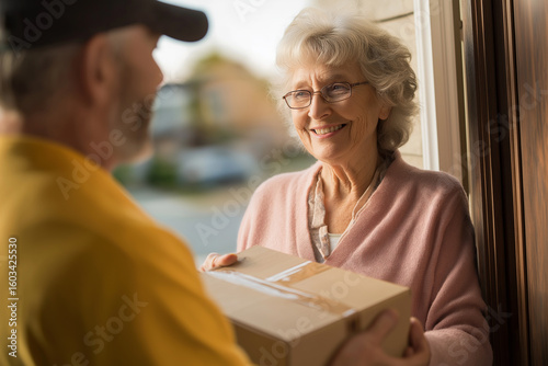 delivery, parcel, senior citizen, home, delivery person, doorstep, receiving, package, ageing, smiling, elderly, courier, residential, client, recipient, kindness, service, community, connection, assistance, convenience, gratitude, interaction, commerce, retail, shopping, online shopping, communication, neighboring, greeting, help, aid, support, care, well-being, friendly, cheerful, happiness, positive, trust, dependability, efficiency