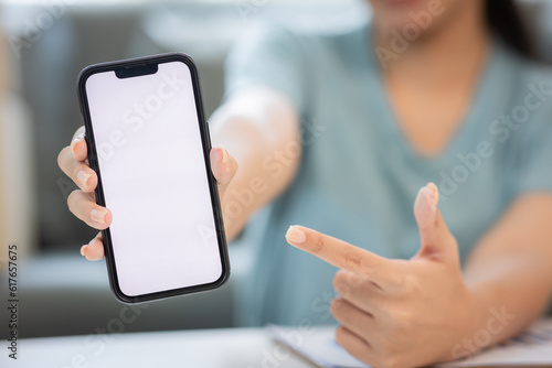 Delivery app. Close-up of smiling young woman in hand showing smartphone with blank screen for mockup woman working with boxes at home