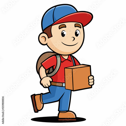 Delivery Boy Cartoon: A cheerful cartoon delivery boy with a backpack happily carries a package. He is wearing a red shirt and blue pants and cap.