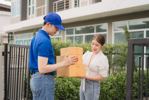 delivery, package, client, driver, happy, smiling, suburban, home, service, convenience, good, receive, satisfaction, online shopping, e-business, logistic, shipping, transportation, courier, delivery man, woman, grateful, surprised, excited, doorstep, box, brown, blue, cap, uniform, residential, neighbourhood, front yard, daytime, sunny, cheerful, positive, trust, accurateness, efficient, fast, speed, service industry, customer service, dependability, efficiency