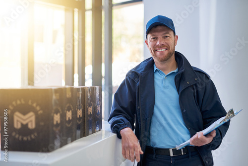 Delivery man, portrait and smile with clipboard for beer stock and brewery supplier inventory with service. Courier, parcel and happy with confidence, boxed and worker with order paperwork at job