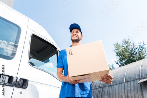 blue, pack, box, package, person, young, people, transport, vehicle, transportation, cardboard, male, car, industry, service, professional, work, job, freight, cargo, van, shipment, delivery, profession, uniform, order, t-shirt, photogenic, men at work, bus, mail, post, delivering, postal, courier, working man, young adult, delivery man, bottom view