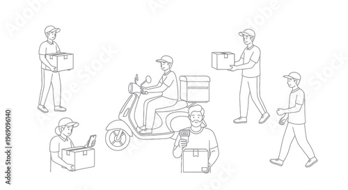 Delivery Service Line Art: Couriers with Boxes and Scooter
