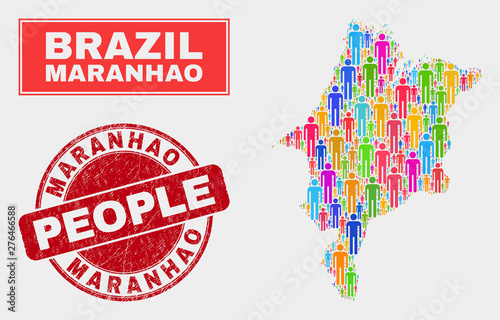 Demographic Maranhao State map illustration. People bright mosaic Maranhao State map of humans, and red round unclean watermark. Vector composition for nation community representation.
