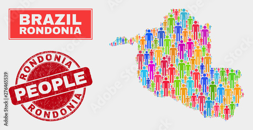 Demographic Rondonia State map illustration. People colorful mosaic Rondonia State map of persons, and red rounded corroded seal. Vector composition for national audience plan.