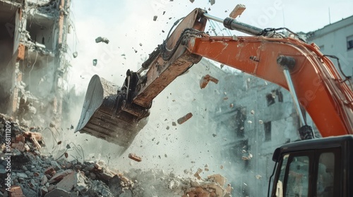 shoveling, demolition, building, construction, arm, bucket, debris, dust, concrete, brick, machine, heavy, equipment, work, site, destruction, ruin, power, industry, chaos, flying, motion, energy, force, impact, fragment, powerful, movement, process, steel, orange, grey, brown, sky, day