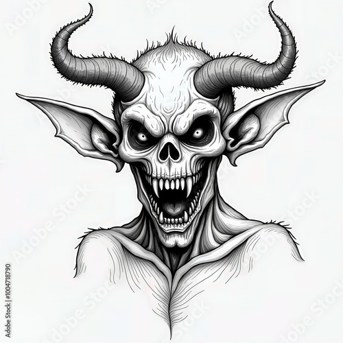 skull, daemon, horn, ear, teeth, illustration, black-and-white, line art, detailed, intricate, fantasy, mythical, scarey, skittish, halloween, monster, creepy, aggressive, intense, dramatic, dark, gothic, horror, supernatural, evil, creature, beast