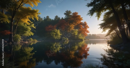 Dense foliage of trees surrounds a serene lake in the evening, water, twilight, forest