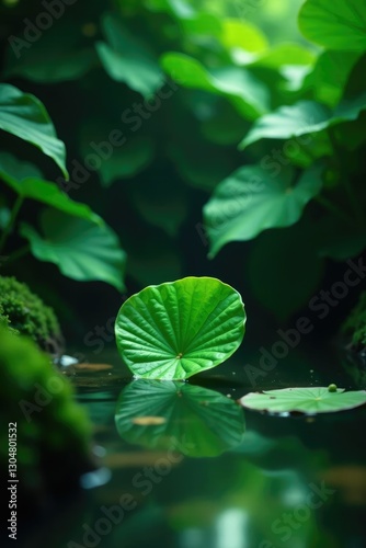 Dense foliage surrounds a solitary leaf in a shallow pool of water, green, calm