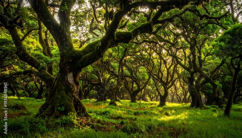 Dense forest scene bathed in golden light. Sunlight streams through the arched canopy of old, moss-covered trees, illuminating the lush, green undergrowth