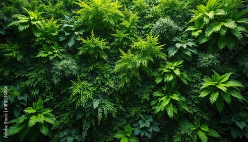 Dense green wall of foliage creates a vibrant vertical garden. Rich plants cover entire surface displaying natural beauty. This image represents sustainable design and biophilic architecture.
