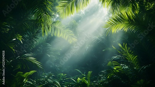 Dense jungle vegetation fills lush tropical rainforest as morning mist and sun rays pierce through canopy. Vibrant green palm fronds and ferns create mystical forest scene with atmospheric fog.