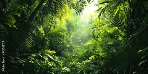 jungle, rainforest, lush, foliage, green, leaf, tropical, vibrant, nature, plant, palm, sunlight, shadow, dense, overgrown, greenery, vegetation, canopy, biodiversity, wilderness, ecosystem, humid, forest, wood, wild, exotic, natural, paradise, growth, life