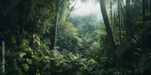 Dense vegetation and towering trees in a tropical rainforest, Realism, Earthy tones, Photography