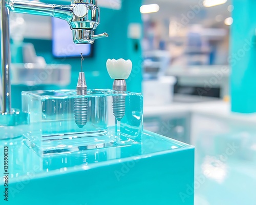 dental, implant, teeth, dentistry, oral, surgery, medicine, health, care, clinic, treatment, artificial, model, technology, procedure, patient, modern, futuristic, display, exhibit, showcase, glasses, water, water, blue, tool, equipment, sterile, hygiene, precision, innovation, prosthesis, restoration, composite, ceramic, titanium, manufacturing, laboratory, research, education, demonstration, training