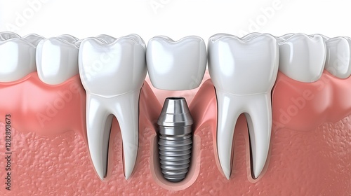 dental, implant, teeth, dentistry, teeth, jaw, gum, crown, care, oral, health, health care, medicine, medicals, white, background, illustration, healthy, honed, substitution, missing, restoration, surgery, procedure, technology, model, anatomy, human, hygiene, gum, lower jaw, bone, titanium, metal, porcelain, ceramic, realistic, high, quality, detailed