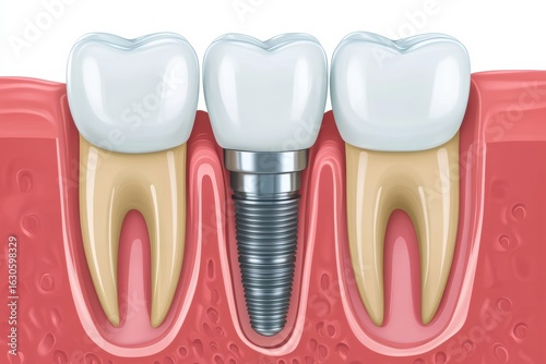 dental, implant, procedure, titanium, crown, jaw, bone, restoration, oral, health, dentistry, treatment, aesthetic, surgical, smile, substitution, teeth, gap, patient, clinic, care, hygiene, cosmetic, technology, anatomy, equipment, design, visualisation, illustration, dentist, gum