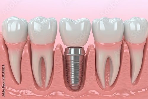 Dental implant restoring a missing tooth in a detailed model of human teeth and gums