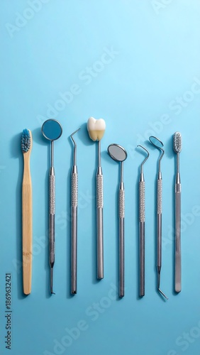 dental, tool, toothbrush, hygiene, health care, clean, dentist, oral, care, medicine, equipment, mirror, probe, exam, teeth, enamel, white, blue, pastel, still, life, vertical, arrangement, set, professional, surface, sharp, metal, bristle, wooden
