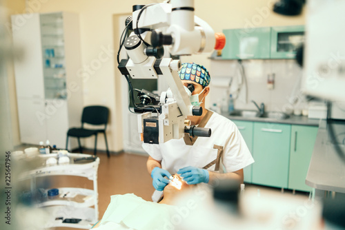 Dentist examine oral cavity of female patient with microscope.