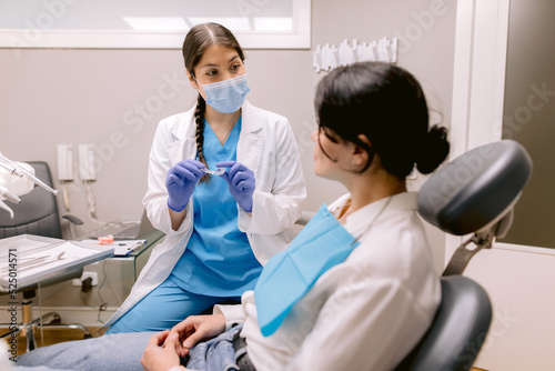 dentist, speak, patient, braces, explain, consultation, dental, orthodontic, woman, clinic, together, talk, sterile, mask, disposable, uniform, chair, to sit, conversation, glove, transparent, orthodontist, dentistry, medicals, professional, job, female, workplace, napkin, interact, health care, workspace, hospital, dialogue, communicate, doctor, profession, oral, latex, material, specialist, work, occupation, medic, young, indoor, blur, horizontal