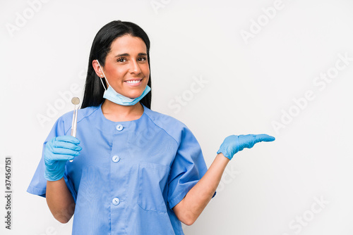 Dentist woman isolated on white background showing a copy space on a palm and holding another hand on waist.