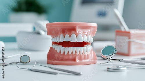 dentists clean and sterilized workspace, showing healthy teeth on model with dental tools like mirrors and probes neatly