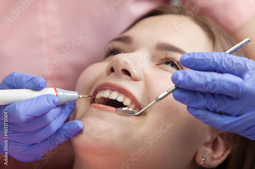 Dentists using dental drill and mirror while examining girl's mouth in clinic. Professional treatment at dental clinic