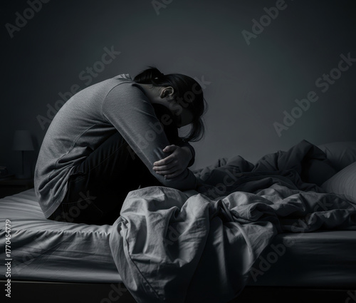 depression, sorrowful, loneliness, anxiety, mental health, distress, despair, woman, bedchamber, isolation, grief, grieved, trauma, frustrated, unhappy, stress, troubled, pensive, introspective, bed, dark, night, sitting, alone, hug, messy, moody, dramatic, monochrome, low light, indoor, adult, young adult, female, human, insomnia, sleeplessness, worried, sleepy, suffering, crisis, silent, desperate, hopelessness, fear, problem, exhausted, disease