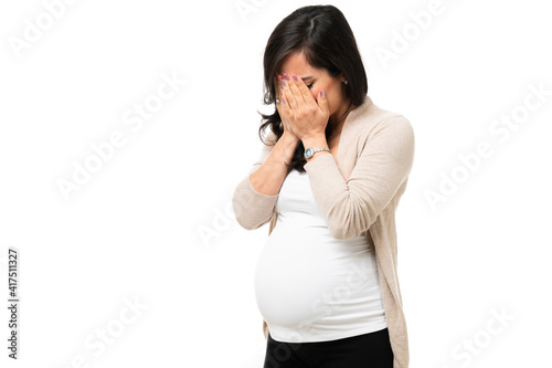 woman, 30s, caucasian, pregnant, adult, people, lifestyle, pregnancy, maternity, expectant mother, belly, casual attire, beautiful, pretty, white, background, portrait, studio, worried, stressed, covering, face, crying, tear, sad, sorrowful, depression, depressed, upset, concerned, sick, suffering