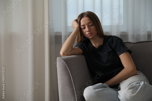 Depressed teenage girl in armchair at home, space for text