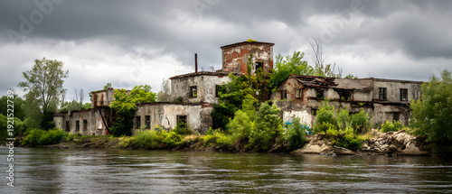 Derelict industrial buildings along urban riverbank decay architectural