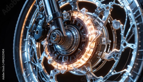 Desain roda motor yang ramping menampilkan detail teknik dan krom untuk proyek otomotif modern, menekankan kecepatan dan inovasi.