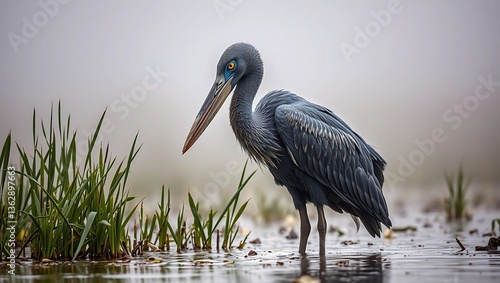bird, heron, wading bird, water bird, aquatic bird, long neck, blue eye, wildlife, nature, avian, ornithology, animal, fauna, water, marsh, swamp, wetland, reed, vegetation, shallow water, misty, serene, calm, tranquil, standing