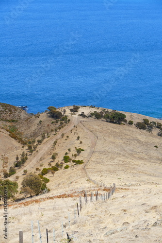 trail, fence, hill, path, ocean, blue, descent, dry, landscape, rugged, gold, nature, walking, adventure, wilderness, route, travel, slope, remote, south, scenery, horizon, coastal, hike, journey, editorial, documentary, natural, scenic, exploration, photo, australia, trek, minimalism, texture, outdoors, sand, sea, coast, road, vacation, mountain, panorama, view, dune, summer, sky, beach, water