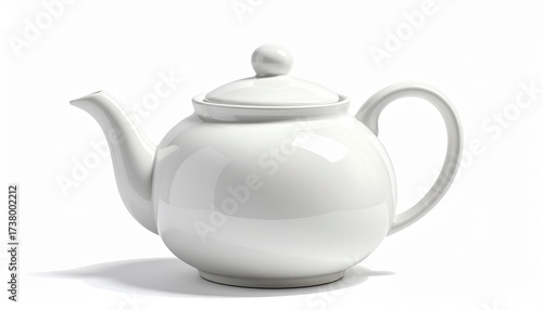 Describe a white ceramic teapot with rounded body, curved handle, spout, and lid on a white surface. Highlight its glossy finish, classic design, and utility for brewing and serving tea.