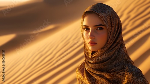 woman, headscarf, desert, dune, sunset, gold, landscape, beauty, serene, nature, culture, travel, warm colors, calmness, sunlight, ethnic, fashion, traditional, elegance, middle east, isolation, adventure, exploration, portrait, scenic, peaceful, soft light, horizon, dune, warm tones, identity, individuality, calm, environment, atmospheric, shadow, silhouette, model, mystery, arab, face, lady, 1, looking, sad
