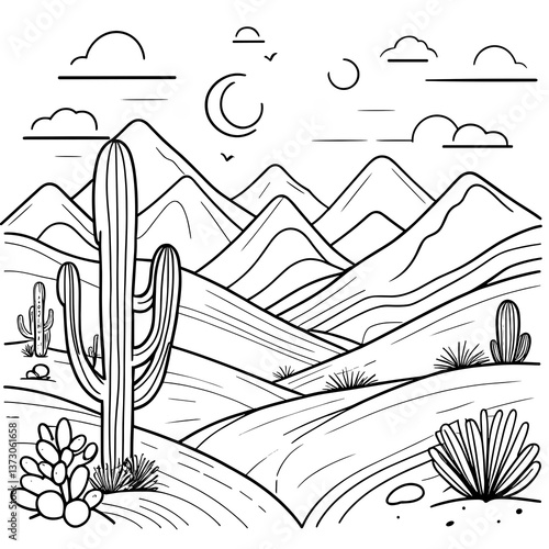 Desert landscape line art illustration with cacti, black and white, representing night nature scene coloring page