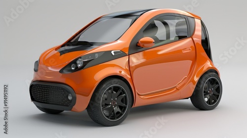 Design a 3D model of a compact city car, emphasizing its small size, efficiency, and maneuverability. Highlight features like foldable mirrors and a panoramic roof.