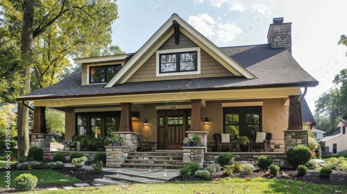 Design an image of a craftsman-style home exterior with a wide front porch, exposed beams, and stone pillars, emphasizing handcrafted quality and traditional charm.