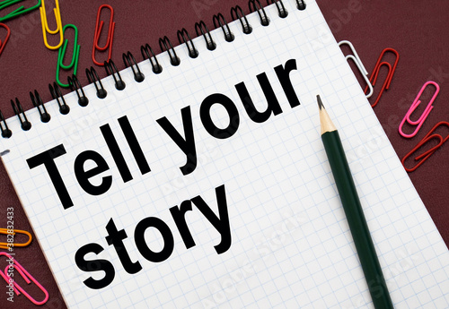 Design concept - Top view of white spiral notebook and pencil with text TELL YOUR STORY isolated on red background for mockup