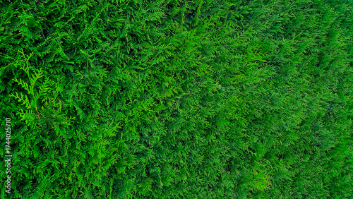 Design of green coniferous cedar thuja. Hedge between plots. Natural concept for fence design