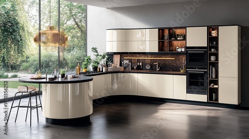 Designer kitchen with a minimalist aesthetic and clean lines..