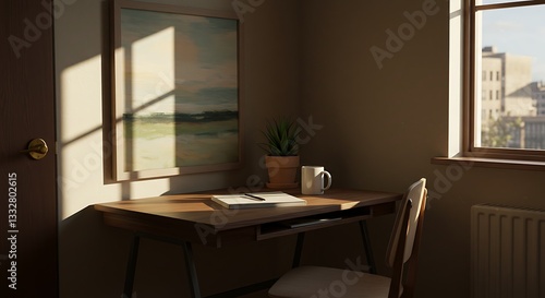 desk, writing, window, sitting, indoor, plant, radiator, chair, artwork, painting, notebook, crayons, mug, table, door, corner, pot, still, life, home, apartment, room, building, city, day, sunlight, shadow, beige, brown, calm, cosy, workspace, interior, modern, minimalist, desktop, furniture, studying, relaxing, lifestyle