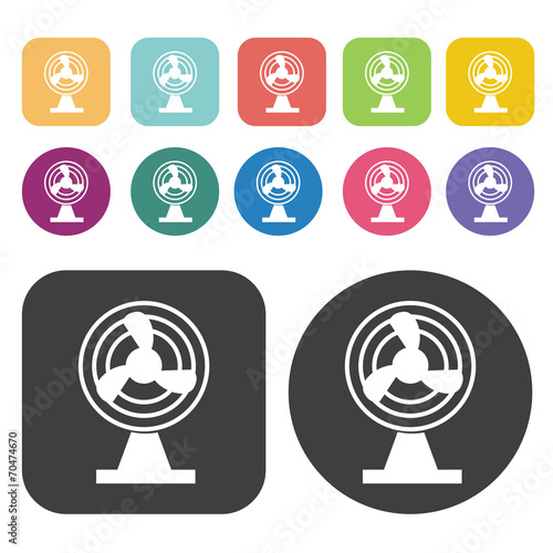 Desk fan with wire guard icon. Fan icon set. Round and rectangle