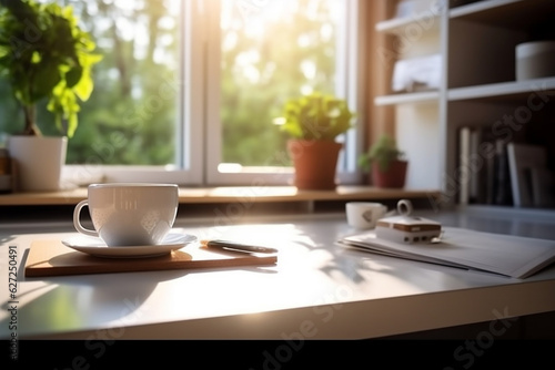 Desk of free space and kitchen interior, wooden table, kitchen window and shelves. Aesthetic photo, macro close up, bright tone. AI Generative