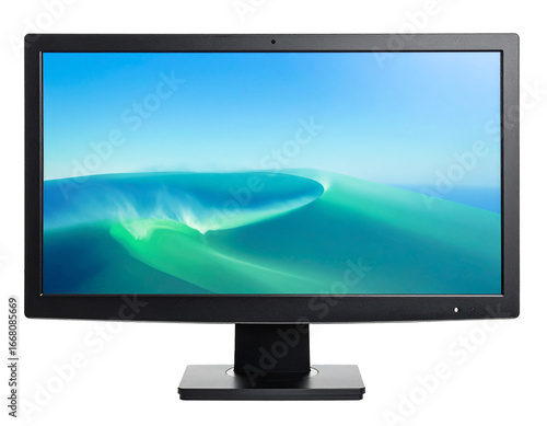 Desktop monitor, screen, technology, display, computer, electronics, isolated, white background, device, office, work, digital, modern, equipment, high-resolution, flat, sleek, professional, productiv
